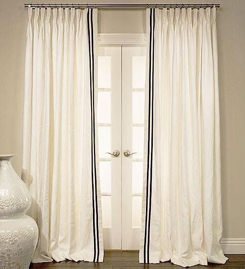 Use a ribbon of your choice, line it up along the edge of your curtains, and attach it to the fabric using iron-on mending tape.